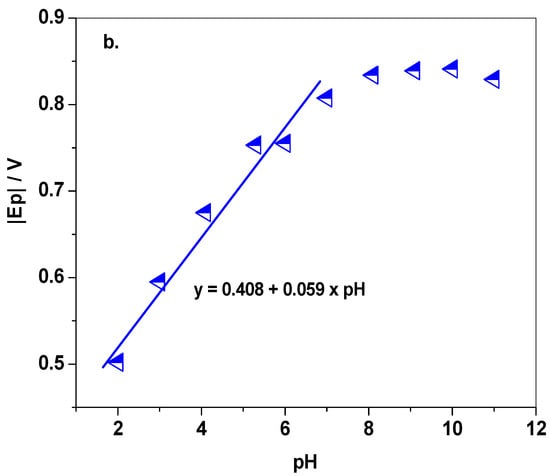The variation of the modulus of peak current |Ip| and peak potential |Ep| with the solution pH can be seen in Figure 5a,b, respectively. In the first case, the strong decrease in peak intensity in alkaline solutions (pH 8–pH 12) indicates that the protonated species of cymoxanil are involved in the redox process. In addition, the peak potential shifts towards more negative values (pH 2–pH 7), which also confirms the H+ involvement in the reduction process. For pH 2–pH 7 range, the linear regression equation was determined to be: y = 0.408 + 0.059 × pH. Above pH 8, a plateau was reached which correlates very well with the pKa of cymoxanil molecules (pKa = 9.7 ± 0.2). Based on such information the optimum pH was selected to be pH 6. Another important reason for selecting a slightly acidic solution for further experiments was related to the hydrolysis of cymoxanil; the molecules hydrolyze in neutral and alkaline aqueous solutions, according to data sheet specifications. In pH 7 solution, the hydrolysis constant is 34 h while in pH 9 solution, the constant is 31 min [42].