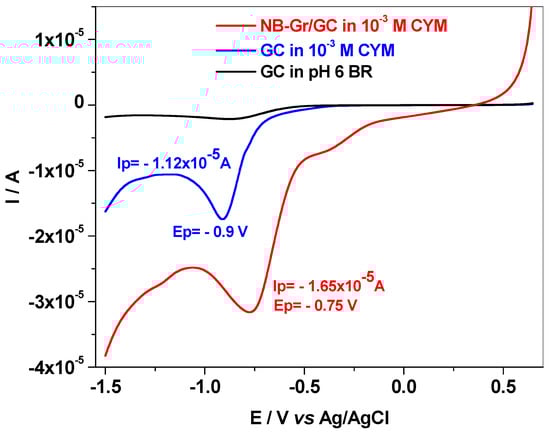 LSVs recorded with NB-Gr/GC electrode (red) and bare GC (blue) in pH 6 BR solution containing 10−3 M CYM; GC in pH 6 BR (black); scan rate 10 mV/s.