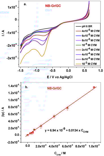 LSVs recorded with NB-Gr/GC electrode in CURZATE MANOX solutions containing various CYM concentrations (from 6.3 × 10−5 to 6 × 10−4 M); pH 6 BR supporting electrolyte; scan rate 10 mV/s (a); the corresponding calibration plot obtained from the standard addition method (b).