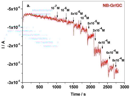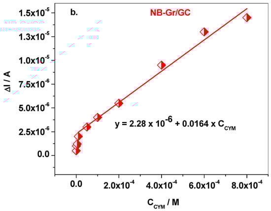 Next, the amperometric technique was employed to further test the CYM detection with the NB-Gr modified electrode. Figure 8a shows the amperometric curve recorded in pH 6 BR (potential −0.8 V vs. Ag/AgCl) after the addition of known concentrations of cymoxanil. The corresponding calibration plot (background subtracted) has the linear regression equation ΔI = 2.28 × 10−6 + 0.0164 × CCYM and is presented in Figure 8b. By amperometric measurement, both the limit of quantification and limit of detection were considerably smaller. Hence, LOQ was determined to be 5 × 10−6 M, while LD was 1.51 × 10−6 M.