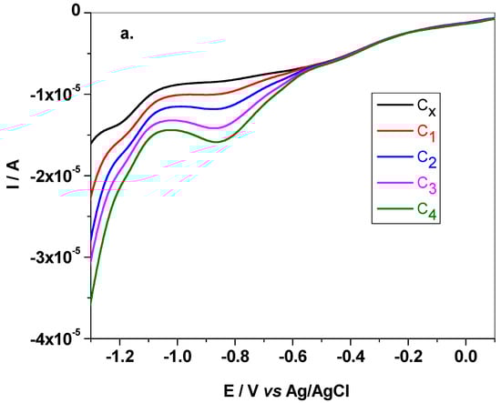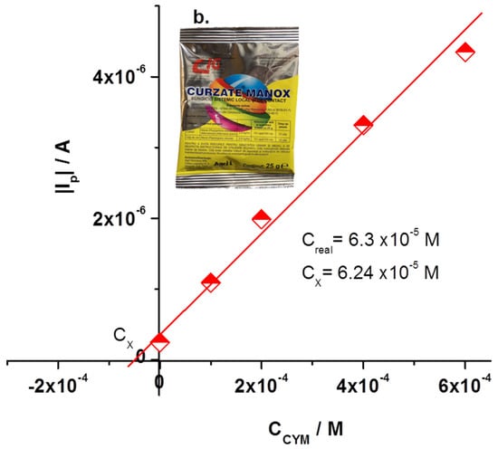 The NB-Gr/GC electrode was also tested for its ability to detect CYM from a commercial product (CURZATE MANOX; produced by Chemical Independent Group, Romania) by the standard addition method. The product contains 5% CYM, 18% mancozeb (C4H6N2S4Mn · C4H6N2S4Zn) and 25% Cu2(OH)3Cl. To 5 mL of pH 6 BR containing a certain concentration of CYM (from CURZATE MANOX) were added known concentrations of CYM from a stock solution (10−3 M) (Figure 9a). The generated signals were recorded for each concentration by LSV. After reading the peak current and plotting the calibration curve (Figure 9b) the concentration of CYM was found to be 6.24 × 10−5 M, giving a recovery of 99%.