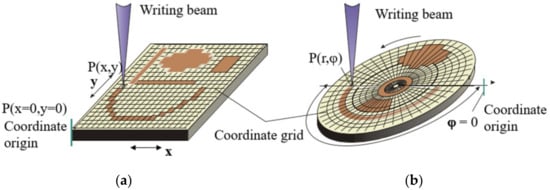 Figure 1 shows examples of the formation of the arbitrary patterns by means of both SLLS types. Figure 1a shows that the origin of coordinates for of the X-Y SLLS can be set arbitrarily. However, after the origin setting is made, it must also be stationary relative to the CGH blank. As it is evidently from Figure 1b the origin of coordinates for the CLWS should be aligned with the spindle rotation axis in order to avoid distortions of the formed pattern. The problem is how to check that the origin of coordinates during writing process is still in the same place as at the beginning. When several small patterns are formed on one blank, this is not so important if their relative position is not critical for task specification, and the drift of the origin of coordinates during the writing of one pattern is negligible. When writing large CGHs, where the mutual positions of all diffactive zones are set and very important, it is necessary to track that the origin of each axis of writing beam motion is associated with a specific place. The task can be solved by preliminary formation of sensor elements or alignment marks on the blank of the CGH. When using thermochemical [26,27] or thermo-structural [28] writing, the sensor element can be written right before fabrication of main hologram by burning, for example, a ring in the center of the CGH blank when using CLWS [17]. At usage of photoresist as recording material, the formation of the sensor element requires a separate complete technological cycle from applying the photoresist to etching the mask layer which is the carrier of the sensor element [21].