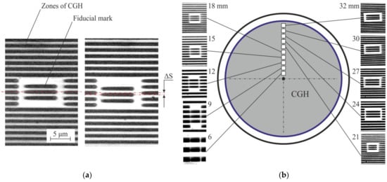 The idea of using marks built into CGH pattern was first realized for CLWS. At the beginning, the marks did not have their own constant structure, but were actually a part of the CGH. Small sections of CGH were written before writing process at certain radii [22]. The sections were placed in a special window of a slightly larger size so that the mark would not merge with it when writing CGH. This made it easy to find the marks on the CGH pattern when photographing and taking measurements. Figure 3a shows examples of photographs of such marks and their schematic arrangement on a CGH substrate (Figure 3b). This type of marks has proven itself well at the beginning of use, but there are several significant disadvantages at once: