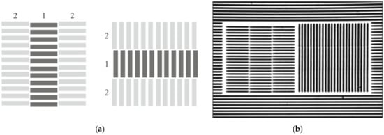 In this regard, we have proposed a new type of two-coordinate built-in marks and a technique for their automatic measurement, based on the interferogram processing algorithm [30]. Using this new type of the built-in marks, it was planned not only to automate the measurement process, but also to significantly increase its accuracy (estimated to be up to 30–50 nm). Figure 6 shows a general diagram (a) and photomicrograph (b) of this type of built-in structures.