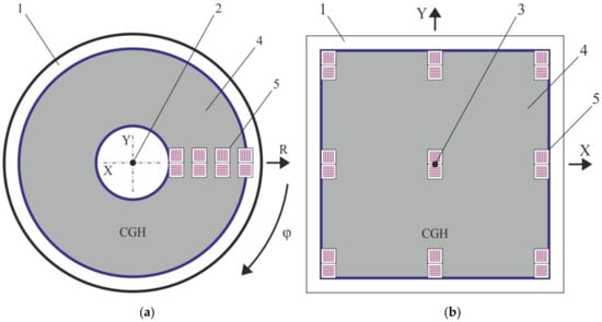 Layout of two-coordinate marks for writing systems: circular (a); X-Y (b). 1—optical substrate, 2—axis of rotation of the optical substrate, 3—origin of coordinates for X-Y laser beam positioning system, 4—CGH, 5—small window areas with coordinate marks.