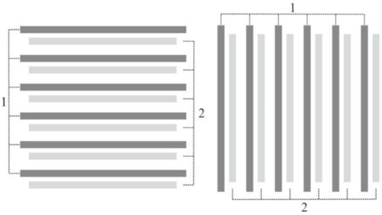 Initially, a variant of a one-dimensional diffractive sensor element (DSE) was proposed and investigated [31]. 1D DSE is two overlayed diffractive gratings with the same duty cycle and period. Figure 8 shows a configuration of a twin 1D DSE, which allows one to determine the error at once by two coordinates of the SLLS. First couple of the gratings (1 in Figure 8) is written before CGH writing at specified radii with a specified period, and the second one (2 in Figure 8) is written with a predetermined shift value relative to the first during CGH writing upon reaching the specified radii.
