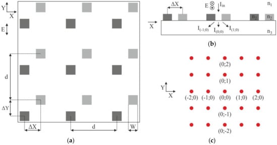 Figure 9a shows the geometry of a 2D DSE simulation. The dark gray color denotes the 2D grating with period d formed before the writing of the CGH, and the light gray color denotes the shifted grating formed during the writing process. The feature size W in the calculations was 1x1 µm. Vector E indicates the direction of polarization of the probe laser beam, which was used in calculating DE. Figure 9b shows a cross-sectional geometry of the simulation (side view). For 2D DSE, the diffraction efficiency (DE) of the diffraction orders was calculated in the substrate material (i.e., without taking Fresnel losses upon reflection of radiation from the back side of the substrate into account—when modeling 1D DSE, reflection from the substrate was taken into account). Figure 9c shows the designation of the key diffraction orders in the formed diffraction pattern. Since the diffraction pattern for 2D DSE diverges in space along the X and Y axes, the diffraction orders (DO) are numbered by two values m1 and m2, each of them indicates a serial number along the X and Y axes, respectively.