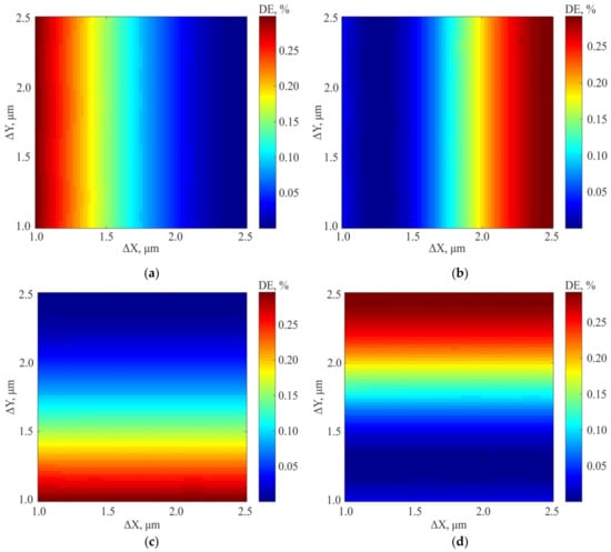 The obtained simulation results show that the diffraction efficiency of the orders (1; 0) and (2; 0) lying on the X axis is practically independent on the center shift for the second inscribed 2D grating relative to the first one along the Y axis. However, when the center is shifted along the X axis, a redistribution of energy between the first and second diffraction orders is observed (Figure 10a,b). This is also true for diffraction orders (0; 1) and (0; 2) lying on the Y axis, for which the energy redistribution is observed depending on the ΔY shift (Figure 10c,d), but their DE is practically independent on ΔX shift. Thus, the energy redistribution is observed at measuring the diffraction efficiency of four diffraction orders. It can be used to estimate the shift along both coordinates happened during writing. Qualitatively, the graphs of the redistribution of the diffraction efficiency between the DO for the ΔX and ΔY shifts coincide, and their quantitative discrepancies are insignificant. In this regard, below the calculated data for the diffraction efficiency of the test gratings will be presented for the shift of the structure along one coordinate (ΔX).
