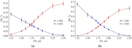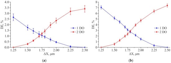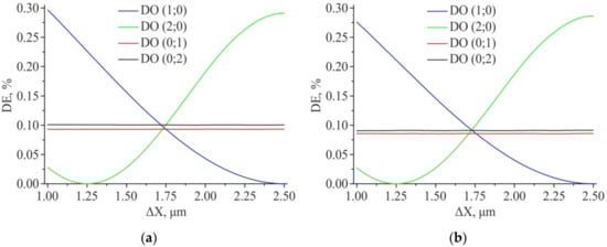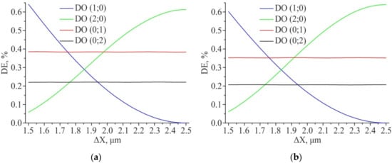Results of modeling the diffraction efficiency for the amplitude structure 2D DSE (ΔY = const = 1.75 µm): “Positive” structure (a); “Negative” structure (b). Feature size—1 µm × 1 µm.