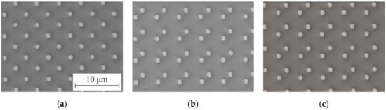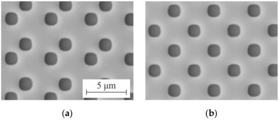 Figure 15 shows microimages of the 2D DSE structures written on the CLWS300IAE and obtained with SEM. These structures are Cr pillars on a fused silica substrate. The measured size of the written structures forming the test 2D gratings in the experiments were 1.1 × 1.1 μm. The structures written on the X-Y SLLS DWL66+ are transparent holes formed in the chromium film. The dimensions of the formed 2D gratings of the holes were ~1.3 × 1.3 μm in the experiments. SEM microimages of these structures are depicted in Figure 16.