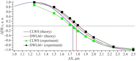 Figure 18 shows the graphs ∆DE12 for diffraction orders (1; 0) and (2; 0). The theoretical calculation was made for structures written on CLWS with W = 1 µm, and for structures written on a DWL66+ with W = 1.3 µm. The obtained experimental and calculated data are in good agreement with each other. At the same time, it is important to notice that the equilibrium point shifts with a change in the feature size. The parameter ∆DE12 changes by ±25% of the maximum possible value in the error range of ±100 nm which is considered as admissible for CGH. The error of DSE method should not exceed 20 nm even taking into account the 5% error typical for photoelectric measurements.