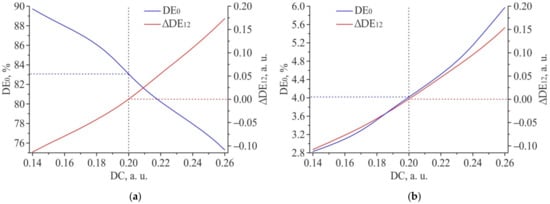 In addition, it can be noted that a change in the feature size of the 2D DSE structures affects the diffraction efficiency of the 0th diffraction order. Figure 19 shows the results of modeling the dependence of DE for 0th diffraction order (DE0) on duty cycle for “positive” (a) and “negative” (b) 2D DSE structures. The duty cycle is defined as the ratio of the width of the individual feature (W in Figure 9a) forming the 2D DSE to the grating period d: