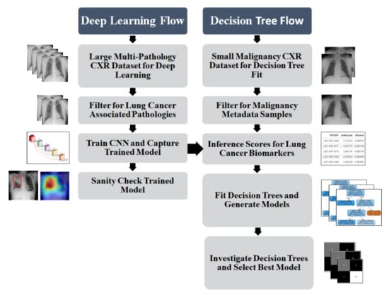 Firstly, we investigate lung pathology features that are considered biomarkers closely associated with lung cancer. We then use CXR examples of these pathologies to train a multi-class deep learning algorithm. Secondly, the score for each pathological feature is inferenced from the trained model for two independent lung cancer CXR datasets for which malignancy scoring metadata is available. Finally, this inferenced score tuple is fitted to the malignancy data for each patient using a shallow decision tree, with the most accurate decision trees extracted for discussion and further refinement. This process is illustrated in Figure 2.