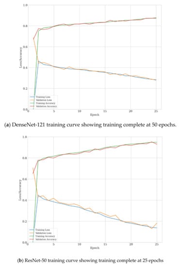 We followed standard practice employed in transfer learning [65] and replaced the network head fully connected layer (by default 1000 neurons) with the number of classification outputs required by the experiment being five. These five output nodes matched our five selected features being Atelectasis, Effusion, Mass, No Finding, and Nodule. This network was then fine-tuned using the training data subset of ChestX-ray14, achieving AUC-ROC results consistent with state-of-the-art for this dataset in consideration that we have restricted classes to PA view only and under-sampled (Table 2). All models converged well as shown in Figure 3, with the ResNet based networks being fully trained at 25 epochs compared to Densenet-121, requiring around 50 epochs to fully train.