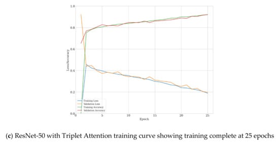 Training and validation loss/accuracy curves for DenseNet-121 (a), ResNet-50 (b), and ResNet-50 with Triplet Attention (c).