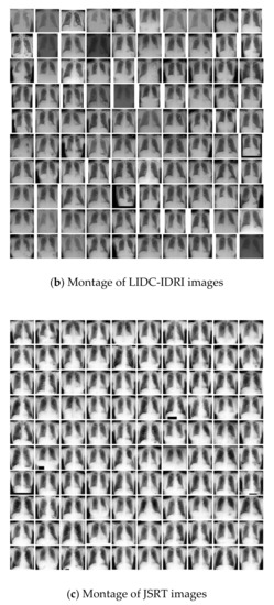 CXR montages for (a) ChestX-ray14, (b) LIDC-IDRI and (c) JSRT datasets showing inter and intra dataset brightness and contrast variation.