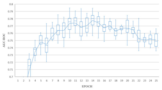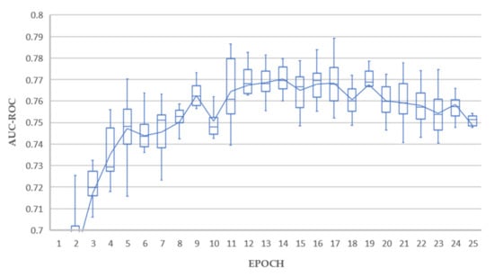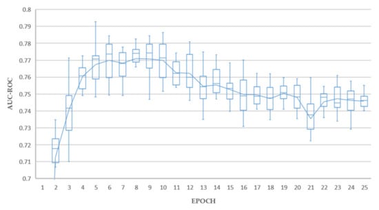 Excellent holdout testing results were achieved from all experiments. Test A achieved a maximum average AUC value of 0.789 at epoch 17. Tests B achieved a maximum average AUC value of 0.793 at epoch 5. Test C achieved a maximum average AUC value of 0.795 at epoch 10. Each of these results could be considered outliers from individual runs, and the average lines plotted in Figure 5, Figure 6 and Figure 7 give a better indication of real-world performance accounting for error margins, being 0.770, 0.771, and 0.777 for tests A, B and C respectively.