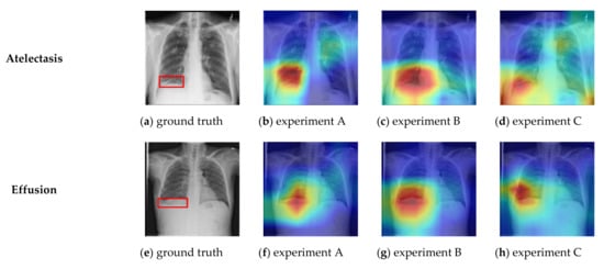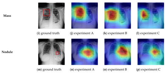 The ChestX-ray14 dataset provides bounding box co-ordinate metadata for the pathologies present in a small subset of CXR images. These bounding boxes have been hand-labelled by a board-certified radiologist [22] and are useful for disease localization ground-truth comparison to classifier predictions. We used a Grad-CAM [68] visualization to compare our models’ predictions to ground truth from the ChestX-ray14 dataset bounding metadata with a selection of results shown in Figure 8a–p.
