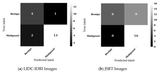 For testing, the LIDC-IDRI and JSRT datasets were also combined by aligning diagnosis labels and assigning JSRT benign images to a diagnosis label of “1” and malignant images to a diagnosis label of “2”.
