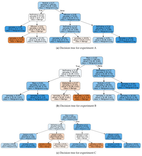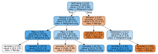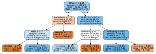 The models for each training epoch up to 25 epochs were used to extract pathological feature scores for the LIDC-IDRI, JSRT and combined image sets by inferencing. This resulted in a total of 250 fitted decision trees per experiment. A seven-column csv template was prepared containing columns for the Patient ID, placeholders for the five features of interest (including the “No Finding” class), and the diagnosis score 1 to 3 as determined by four experienced thoracic radiologists [69]. LIDC-IDRI diagnosis scores 2 and 3 were combined into a single malignancy class with 65 images representing malignant diagnosis and thereby allowing for a binary separation. Values for “Atelectasis”, “Effusion”, “Mass”, “No Finding” and “Nodule” were inferenced from the deep learning models as a score tuple and written to the placeholder columns to complete a data-frame of patients, inferenced feature scores and diagnosis labels.