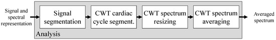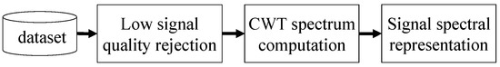 Figure 2 presents our proposed processing strategy. As can be observed, once we had our dataset, we applied a low signal quality rejection to remove low-quality signals for the analysis. Then, the CWT spectrum was computed to obtain the spectral representation of the signal. These steps are explained next.