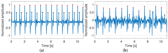Examples of carotid sound recordings: (a,b) show recordings with high and low signal quality, respectively; identified peaks for S1 and S2 candidates are plotted in red and black, respectively.