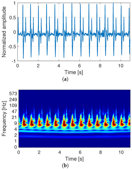 For the proposed signal analysis, we employed a time-scale spectral estimation based on CWT. It was applied using a Morse mother wavelet perfectly symmetric with a time-bandwidth product set to 60. Figure 4 shows an example of the employed signal processing method. Figure 4a depicts a raw carotid sound signal, where the y-axis represents the signal’s amplitude normalized between and 1. Figure 4b shows the CWT spectrum computed from the signal of Figure 4a, where the y-axis represents pseudo-frequencies in Hz ordered in a logarithmic scale. It is important to note that the operation’s original frequency range was from 0 to Hz, where corresponds to the sampling frequency of the recording. Nevertheless, the shown frequency range was reduced for better visualization of the frequency component of interest. In both figures, the x-axis corresponds to the time in seconds.