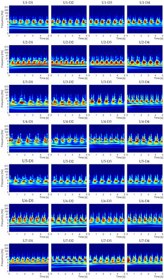 In Figure 5, each example consists of CWT spectra computed from recordings acquired by the four devices, namely D1, D2, D3, and D4, and one device is presented for each column. It is important to note that the exhibited spectra involved only 5 s in length (from the 11 s) for a better visualization to compare their characteristics.