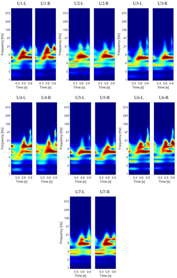 In particular, for U1, the main spectral energy can be divided into two areas: one in the frequency range between 6 and 9 Hz, and the other between 9 and 21 Hz, the latter localized from to s. Unlike the previous case, for U2 and U3, this second frequency range showed a lower energy intensity, i.e., these users presented only the spectral component located around 7 Hz. For U3, however, this component presented a narrower band than for U2.