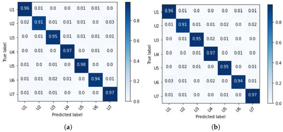 Figure 9 shows the mean normalized confusion matrix: (a) for the samples from the left and (b) for the samples from the right carotid artery. When examining both carotids, it is clear that both sides enable a detection of all users with a probability of >91%. In addition to the confusion matrix, the evaluation metrics were calculated and are in the following table.
