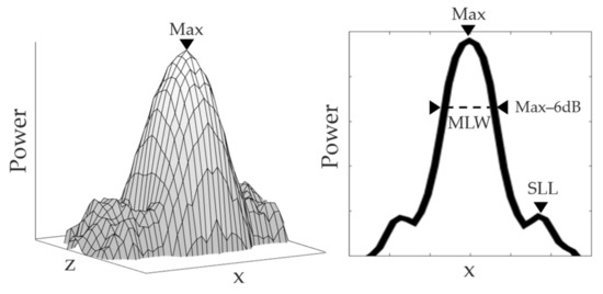 which is exemplified by Figure 2. Here, the power represents the image intensity at a given (x,z) point. The maximum intensity is found at the exact point target position T(x,z). Moreover, since the lateral resolution is the scope of this analysis, the PSF(x,z) can be studied only at this z point, with it being reduced to PSF(x). In the PSF(x), as shown in Figure 2, the algorithm discriminates two important characteristics: the side lobe level (SLL) and the main lobe width (MLW). The SLL is found by a peak search method which looks for the highest value after the maximum in the PSF(x). On the other hand, the MLW is found by the −6 dB drop method. The MLW is the distance xq–xp between two points, where the PSF(x) is equal to the maximum subtracted by −6 dB: