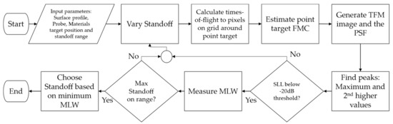 Now that the PSF calculation has been described, the flowchart of the algorithm is presented in Figure 3. The first step of the PSOM is to define all input parameters for the calculation. Then, having the standoff test range, the algorithm starts the PSF calculation at a given standoff, which is varied at each iteration. With the TFM procedure, the times-of-flight and path parameters are calculated. In the sequence, the FMC is estimated based on these values and then translated into the image of the PSF(x,z). The peaks are found and the SLL is calculated. The SLL is measured and verified to see if it is below the defined threshold, (−20 dB here), which was verified as an acceptable image quality. If the SLL is above the threshold, the standoff is varied. Otherwise, the MLW is measured. As such, the algorithm does not waste time computing the MLW for poor image candidates. After the last standoff is used in calculation, the algorithm chooses the standoff with the lower MLW as the optimal probe standoff.