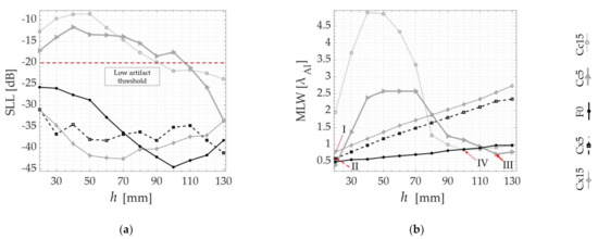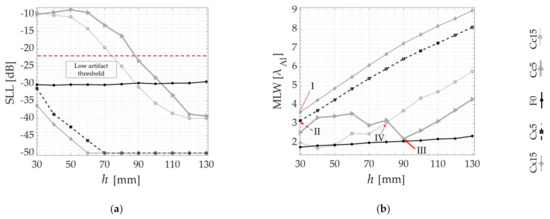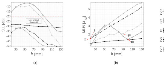 Furthermore, the images generated below the Cc5 and Cc15 profiles, presented in Figure 7c, Figure 8c and Figure 9c, show a different behavior. The TFM images are full of reconstruction artifacts at certain probe standoffs h. At these probe positions, it becomes impossible to identify the presence of the reflector inside the specimen. The SLL verified from Figure 7a, Figure 8b and Figure 9a agree with the TFM results, being above the threshold for all these standoffs. Hence, the PSOM discarded these standoffs, and based on the minimum MLW, selected the optimal standoffs III and IV in all defect depths. At the optimal points III and IV, the SAR and the API have values consistent with the tradeoff between the resolution and artifact level. In some cases, the maximum SAR occurs for an also high API, and, therefore, a lower resolution is chosen while keeping the artifact level in the image low.