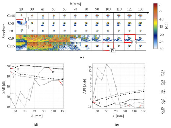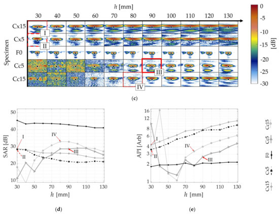 Analyzing the images from defects under the Cx5 and Cx15 surfaces in Figure 7c, Figure 8c and Figure 9c, the area of pixels with intensities between 0 and −6 dB (A−6dB) gets larger as the standoff h increases. Quantitatively, the graphs in Figure 7d,e, Figure 8d,e and Figure 9d,e demonstrate a consistent SAR drop and an API increase as a function of an increase in the standoff h, for all defect depths, in the case of convex top surfaces. This confirms the PSF(x) trends of MLW increasing with h. Therefore, the PSOM indicates the minimum standoff in all convex cases, where SLL is below the threshold and the MLW is minimized. At the standoffs I and II, the SAR is maximum, and the API is minimum.