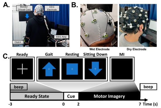 The MI task performed in our experiment included two imagery tasks related to lower limb movement (gait and sitting down) and a resting state. During the MI task, the subject stood on crutches in front of a monitor adjusted to eye level and performed a mental rehearsal [,]. When the subjects were ready to perform the trial, they were instructed to start by pressing the button attached to the crutch. After the button had been pressed, the monitor showed a 3-s fixation cross with a beep and then presented a 2-s random cue, an upward arrow, a box, or a downward arrow, representing walking, resting, and sitting, respectively; the subject was then asked to perform the corresponding MI task for 5 s. After the 5 s of the MI task, a second beep sound played, notifying the subject of the end of the task and telling them to be ready for the next trial.
