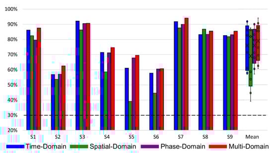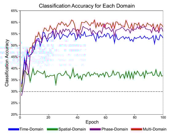 Figure 6 shows the classification accuracy for each domain for the MD-CNN model to confirm that each of the domain-specific learning results was dependent on the electrode type. We investigated the MD-CNN’s classification accuracy for time-domain (blue), spatial-domain (green), phase-domain (purple), and multi-domain representations (red), which were produced by combining and learning the features of the three individual domains.