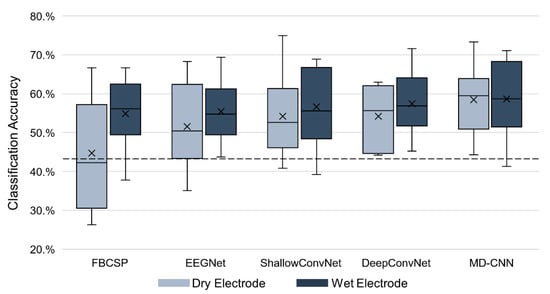 We compared the classification accuracy of the proposed MD-CNN model as a three-class classifier with that of other classifiers (FBCSP, EEGNet, ShallowConvNet, and DeepConvNet) for dry and wet electrodes. The chance level considering the confidence limit was about 43.33% []. Figure 5 and Table 2 show the classification accuracy for several MI BCI models and electrode types. The MD-CNN model had the highest average classification accuracy for both electrode types among the compared models (58.44% for the dry-type BCI and 58.66% for the wet-type BCI). Moreover, our results showed that deep learning-based classifiers outperformed the FBCSP classifier in dry (one-way ANOVA; p = 0.0778) and wet (one-way ANOVA; p = 0.891) electrode BCI. Furthermore, the difference in accuracy between the machine learning-based classifier (FBCSP: 44.74%) and the deep learning-based classifiers (EEGNet: 50.61%; ShallowConvNet: 54.17%; DeepConvNet: 54.20%; MD-CNN: 58.44%) using dry electrodes was larger than that using wet electrodes.