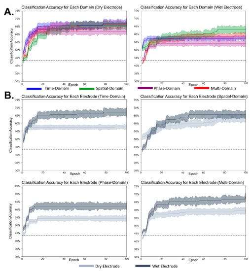 Classification accuracy of the MD-CNN model for S10. The shading represents the standard deviation according to cross-validation. The horizontal dotted line indicates the chance level. (A) Classification accuracy for each domain per electrode: time-domain (blue), spatial-domain (green), phase-domain (purple), and multi-domain representation (red). (B) Classification accuracy for each electrode per domain: dry electrode (light blue) and wet electrode (dark blue).