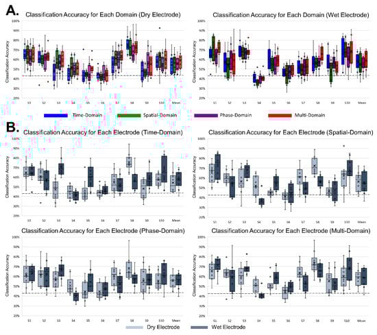 Classification accuracy of MD-CNN for all subjects. The boxplots with scatter points are drawn from 10-fold cross-validation results for each subject. The horizontal dotted line indicates the chance level. (A) Classification accuracy for each domain per electrode: time-domain (blue), spatial-domain (green), phase-domain (purple), and multi-domain representation (red). (B) Classification accuracy for each electrode for each domain: dry electrode (light blue); wet electrode (dark blue).