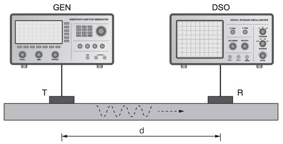 A schematic diagram of the measurement setup, consisting of a signal generator (GEN), a digital storage oscilloscope (DSO) and two transducers, one for transmitting (T) and one for receiving (R) the guided acoustic wave signals, attached to the surface of the test specimen at a fixed distance (d).