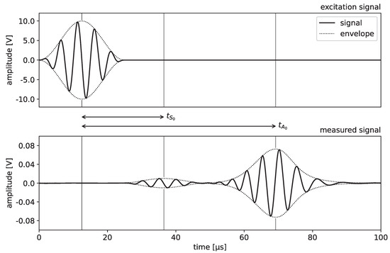 A typical signal recorded by the oscilloscope is demonstrated in Figure 2. In order to extract the propagation times and of both fundamental Lamb modes, the envelope of the signal is calculated and the time shifts of the maxima relative to the excitation signal are determined. We note that, depending on the application, other approaches such as those based on computation of the wavelet transform [26] or the short-time Fourier transform [27] may also be considered for this purpose.
