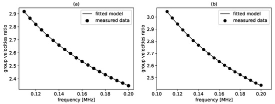 The group velocities ratios derived from the simulated acoustic signals at different frequencies as well as the corresponding solution found by optimization are shown in Figure 4. The good agreement between the data and the solution indicates that the algorithm was able to find an optimum. In fact, the relative error between the determined parameters and the reference was about 1%, as can be seen in Table 1.