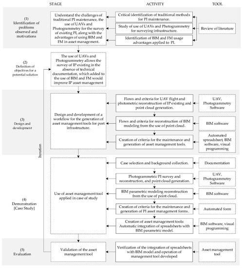 This research studies and proposes the use of technologies and new methodologies to optimize the asset management of existing port infrastructure. Figure 1 details the activities needed to carry out this research, together with the tools and methodologies used in its development. The methodology of research in Design Sciences (Design Science Research Methodology—DSRM) has been used to represent the research process practically, organized in 5 stages: (1) identification of observed problems; (2) definition of objectives for a potential solution; (3) design and development; (4) demonstration; (5) evaluation [12].