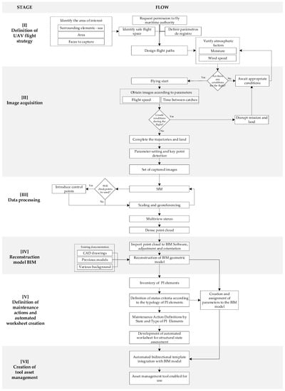 Figure 2 shows the proposed methodology for generating an asset management tool for port infrastructure, consisting of six stages: (I) UAV flight strategy definition; (II) image acquisition; (III) data processing; (IV) BIM model reconstruction; (V) definition of maintenance actions and automated template creation; (VI) creation of asset management tools. This section shows the conceptual aspects of the proposal. The tools used and integrated into the workflow and the codes developed are shown in detail in the application case section.