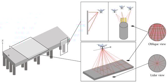 Moreover, new technologies have emerged in the AECO industry to solve the problems of access, information gathering, and digital reconstruction of existing infrastructures [26,36]. Among these technologies, terrestrial laser scanners (TLSs) are mass point acquisition tools which are very useful for the reconstruction of digital models from point clouds [37,38,39]. While this tool allows for massive, fast, and accurate data capture, generating a cloud of high-resolution points, these types of tools are high-cost equipment and require highly trained professionals for their operation, therefore their massive use is restrictive. On the other hand, unmanned aerial vehicles (UAVs) are remotely operated aerial vehicles that have become a common method for mapping and digital reconstruction of infrastructures that, due to their economy and practicality, are preferred over the use of TLSs [40]. Unlike the traditional visual inspection of maintenance plans, the use of UAVs allows for inspections in much shorter times, in turn allowing for more frequent inspections, increasing the recurrence of the structural status updates of the elements of the inspected infrastructure, and thus providing the information for the digital model [11].