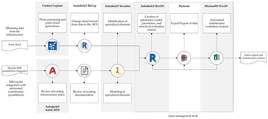 It is important to maintain infrastructure in a highly aggressive environment where materiality is affected by the different pathologies described above. To meet this need, the implementation of a maintenance management tool is proposed based on an integrated BIM model with a maintenance proposal, facilitating the visualization of the elements and their structural state, categorized according to the type of items and repair activities required. Figure 6 details the tools and software used to meet the objective of this application, following the proposed workflow.