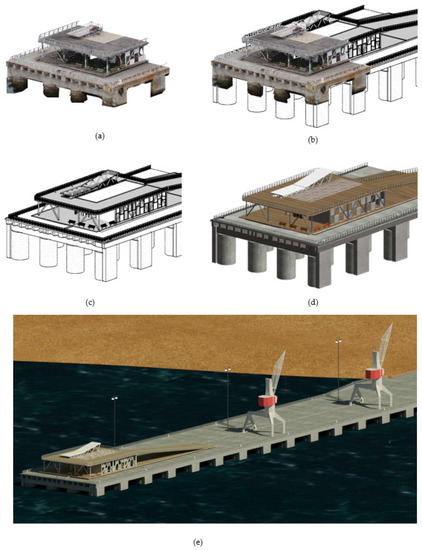 The process of modelling based on the cloud of points and CAD planes starts with the creation of axes and reference planes, which will serve as a guide to locate the elements. Customized families were created for the creation of reinforced concrete elements (slabs, beams, piles, slab protection), railings, and crinoline staircases. To create a generic model for the berths (elements for boat moorings), we used the software Inventor® (Autodesk®, Mill Valley, CA, USA), which allows us to create custom models exportable to Autodesk® Revit with more complex geometries (since Revit has a traditional construction element approach). Figure 8 shows the reconstruction of the 3D model, from the import of the point cloud and CAD drawings to the final model.
