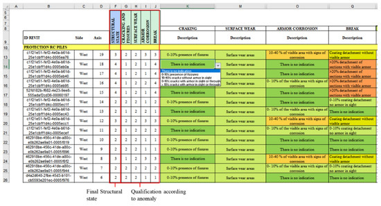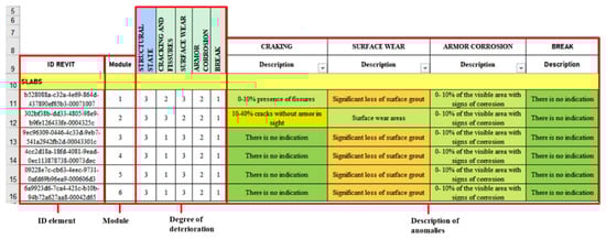 Each degree of deterioration is evaluated with a rating ranging from 1 to 5 for each anomaly, which was assigned to visually facilitate the degree of deterioration according to the type of element (Table 5).
