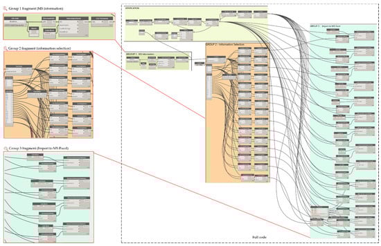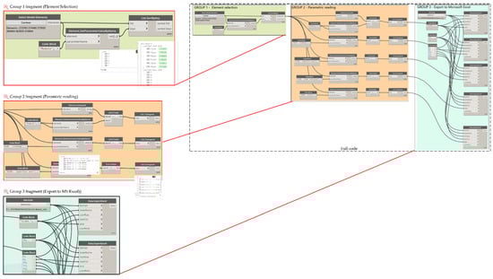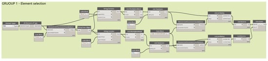Similarly, the flow was performed for the other elements, where in group 1 the information is selected, in group 2 the UniqueID is specified, as well as the parameters of location and anomalies of the elements, and, in group 3, the export of the elements themselves is carried out. Figure 14 shows an example where the flow of group 1 is more extensive. This case corresponds to the battery protections (modelled as a wall), where the number of elements is greater, so other nodes are used to sort the information according to how you want to visualize it in the forms. Prior to this, two parameters were created that will allow organizing the elements in the forms: one corresponds to the “Side”, which can be East or West, and the other corresponds to the “Transversal axis”, which goes from A–1 to A–19.