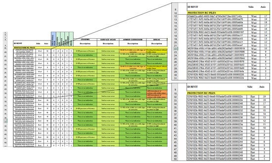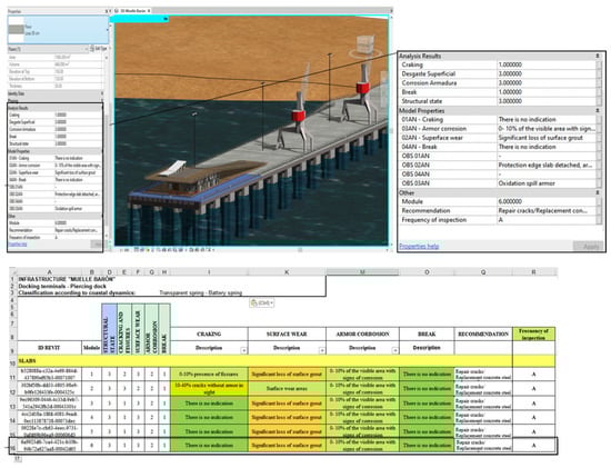An automated Excel spreadsheet was developed, containing information on all the elements of the PI, their ID coding, structural condition, and maintenance measures. In addition, the BIM model was able to incorporate all this information, together with the visualization of the color scales associated with the structural states. The code created allows for the bidirectional connection of data between both work environments. Thus, the maintenance manager will perform his inspections from Excel or Revit, and the information will be updated and synchronized in the other platform. Moreover, if new elements are created in excel or Revit, the other platform will recognize them and update the information, maintaining the bidirectional synchronization.